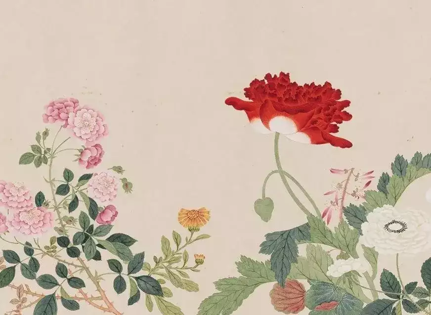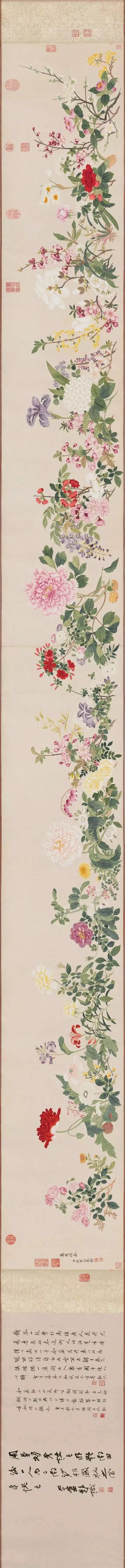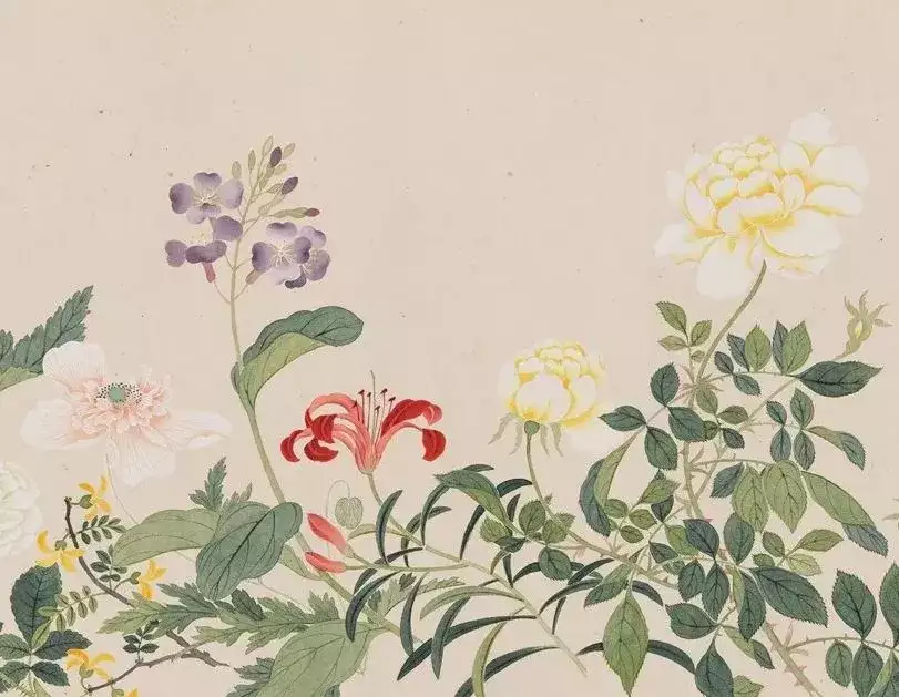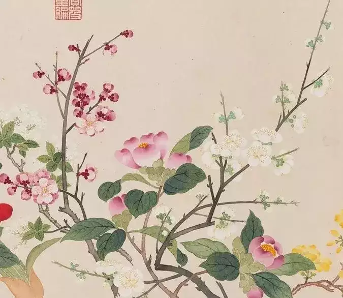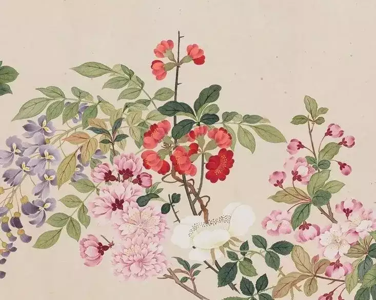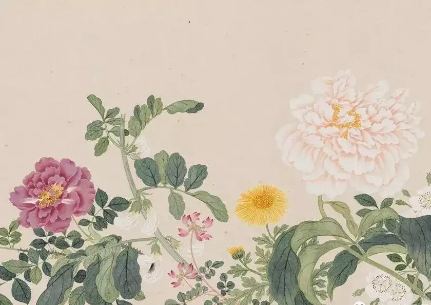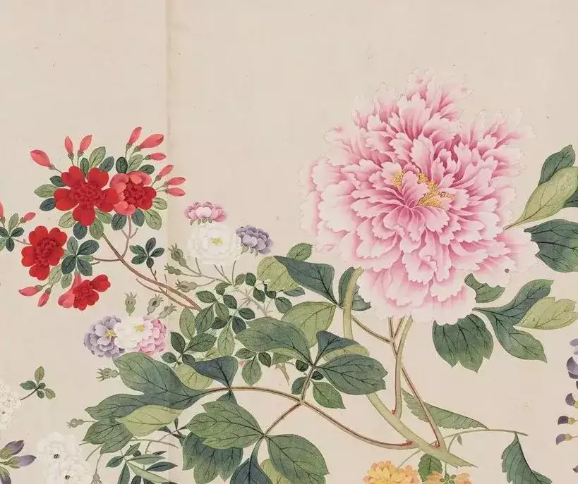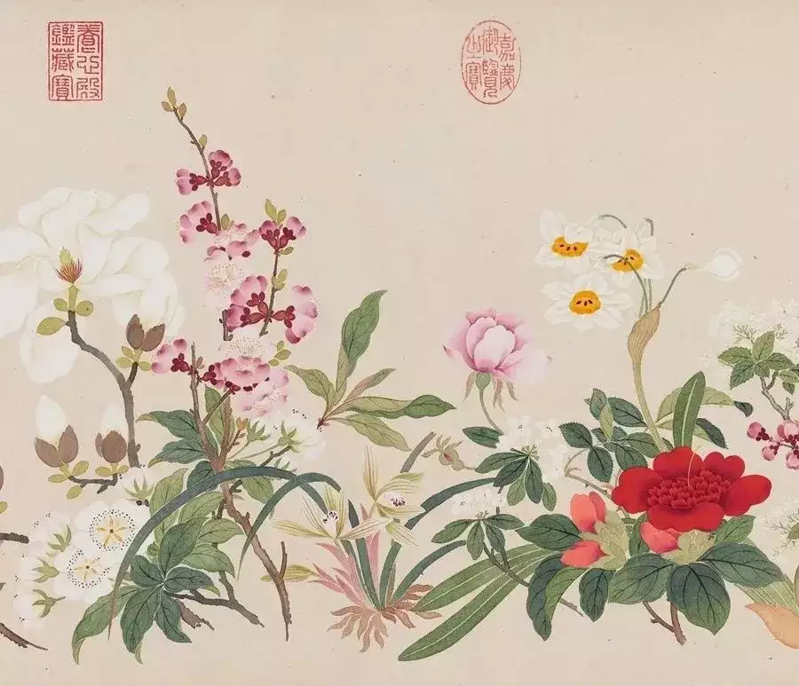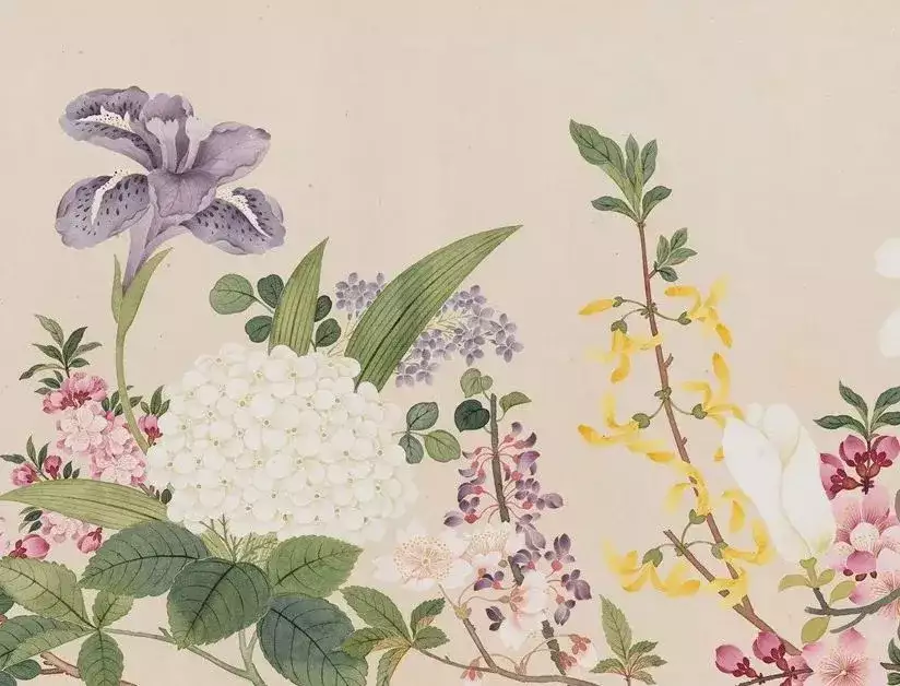 《万有同春图》是钱维城的花卉代表佳作之一。图绘玉兰、牡丹、芍药等众多春季盛开的花品,繁而不乱,艳而不俗,览之“若入众香国中,使人心醉”。作为一幅应制之作,此图寄寓着清代上至君臣下至黎民百姓,对于国祚昌隆、物阜民丰的期盼,而画中花卉的生机勃发之态,恰如其题名——万象更新,春光无限。