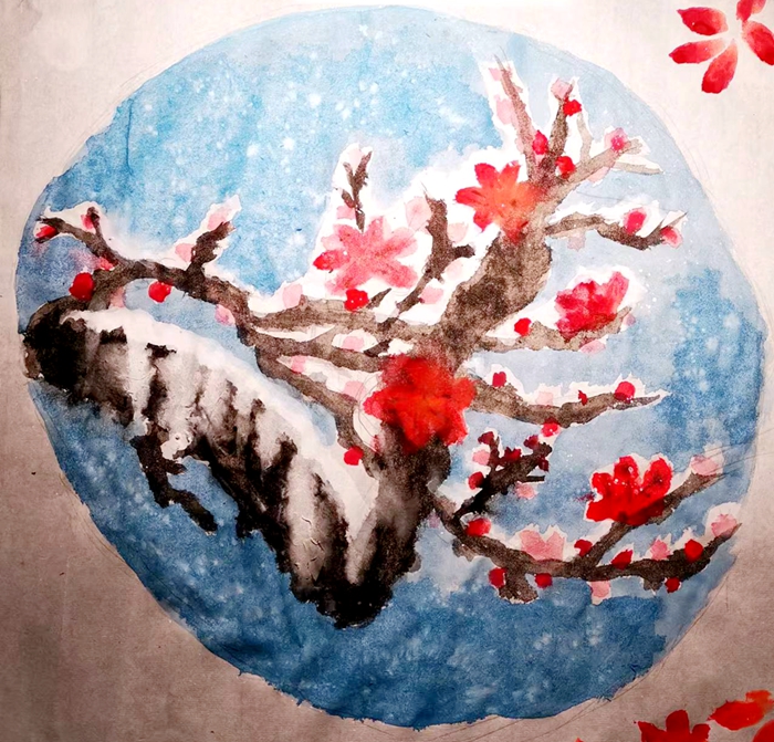 这是第一天上课跟着老师学画的【梅花飞雪】: