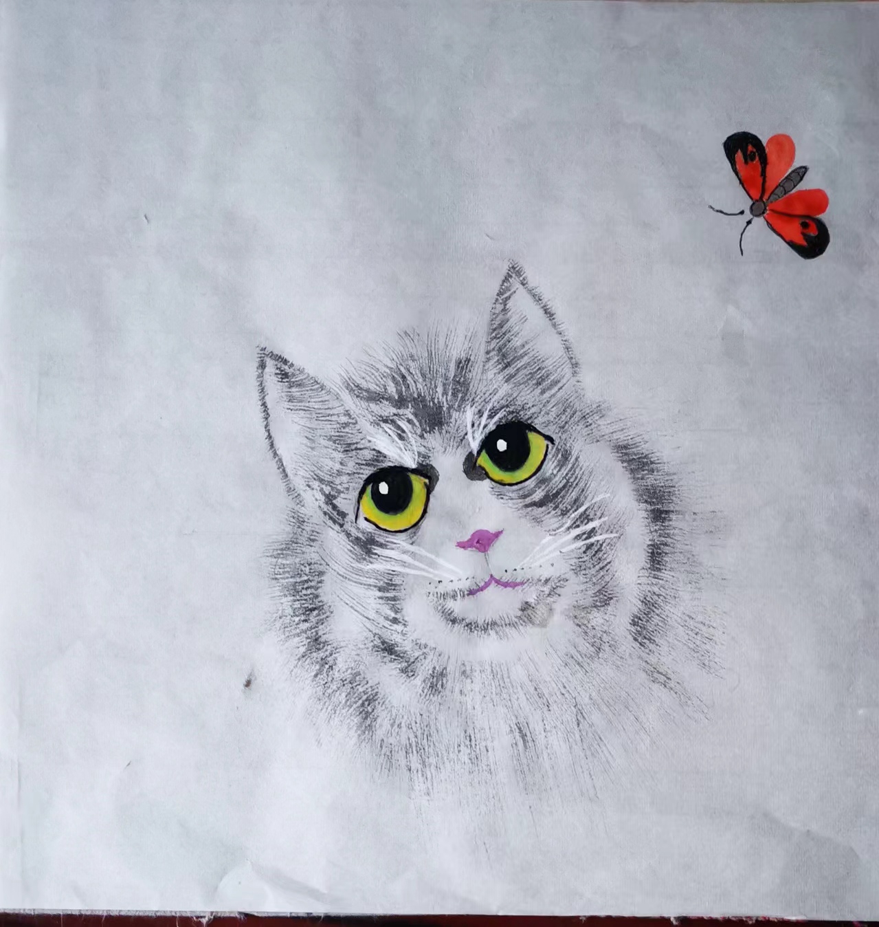 今天老师讲的是【猫咪戏蝶】,结果跟着老师一番手忙脚乱的操作,就画了这样一幅有点抑郁的、歪鼻歪嘴猫,哈哈哈、、、、、、
