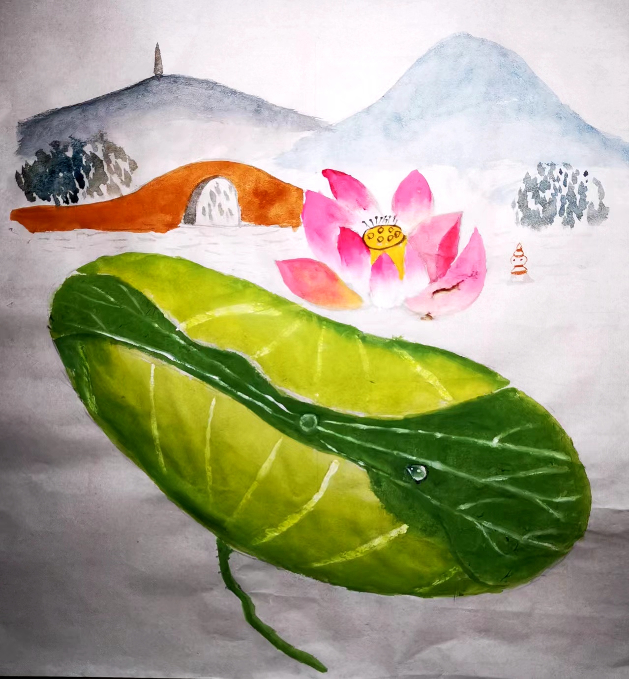 今天老师讲的是【西湖荷花】,结果跟着老师听课,用心跟着老师,就画了这样一幅怪怪的【西湖荷花】: