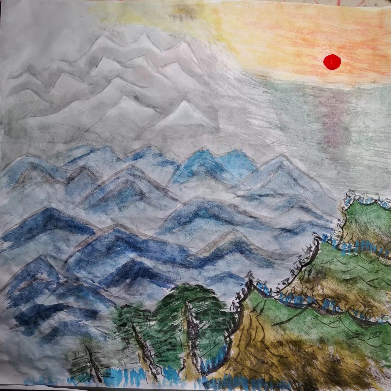 今天老师增加了一节课,讲的是【千里江山】,跟着老师听课,还是一番手忙脚乱的操作,就画了这样一幅所谓的【千里江山】: