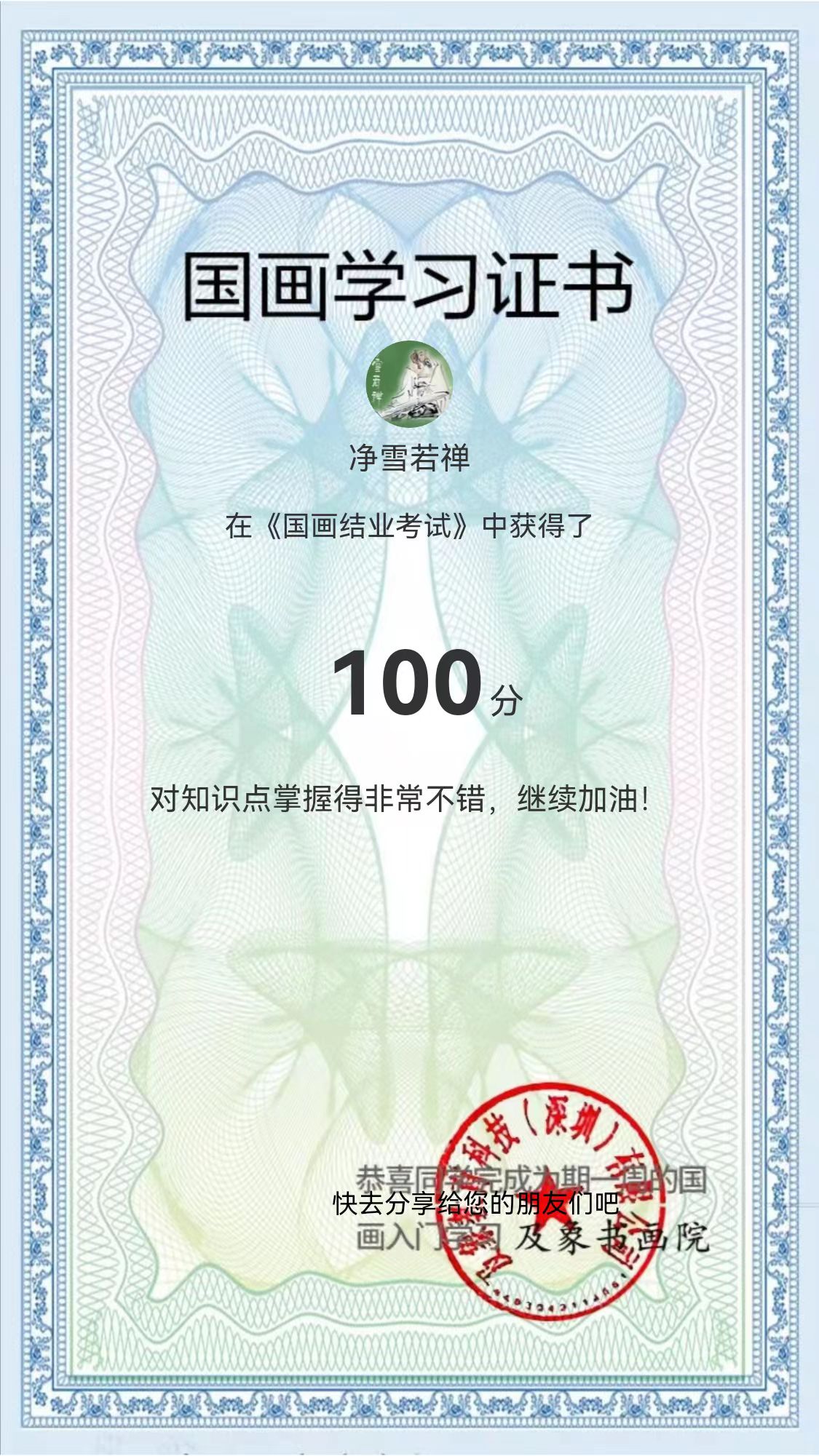 时值今日,【国画小白训练班】就结束了,也就是国画小学班毕业了哦。还发了结业证书: