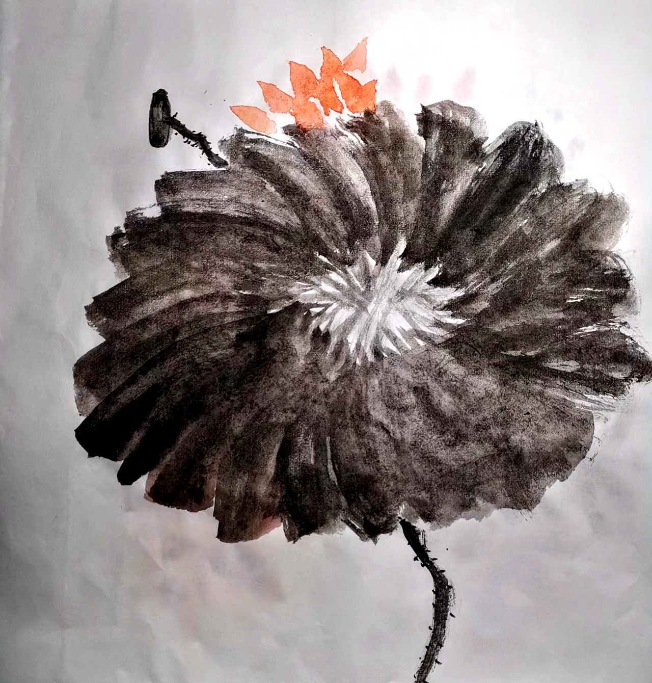 因为是增加的课,所以,老师也顾不上点评了哦。同时,跟着老师的讲解,又画了一幅【墨荷】,有点跟不上,就画了幅半成品【墨荷】: