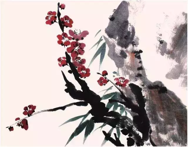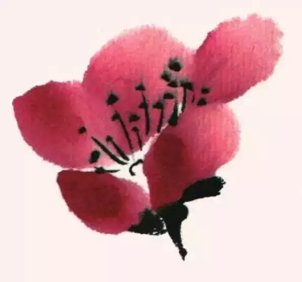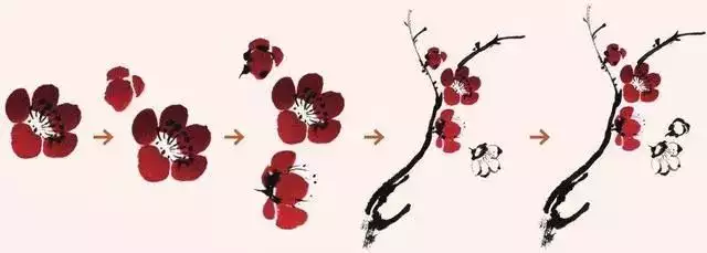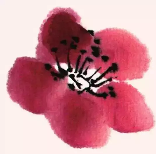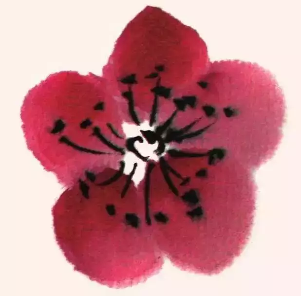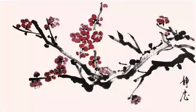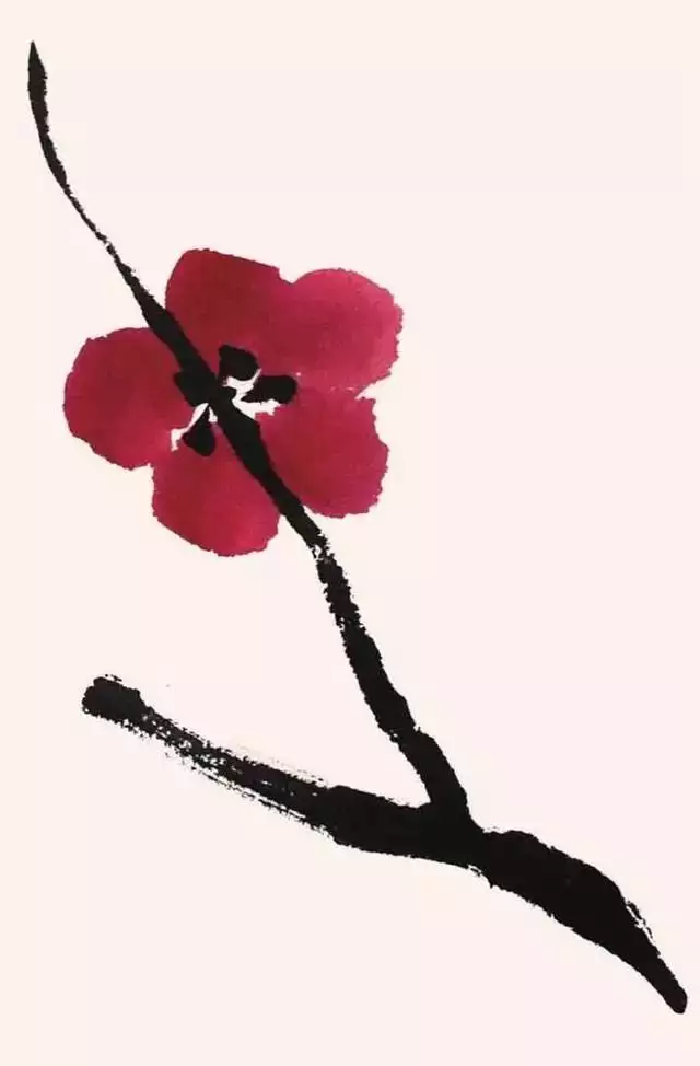 梅花盛开时叶未发,故画梅只需画枝干和花朵而不画叶。花有单瓣、复瓣之别,写意画一般以单瓣入画。梅花主要由主干、枝条、花朵三部分组成。入画顺序为先画干、后发枝、再著花。梅花在花鸟画中是以枝干为代表的花卉,以表现枝干为主。只要把主干枝条画好了,再画花蕾、苔点等就较为容易了。