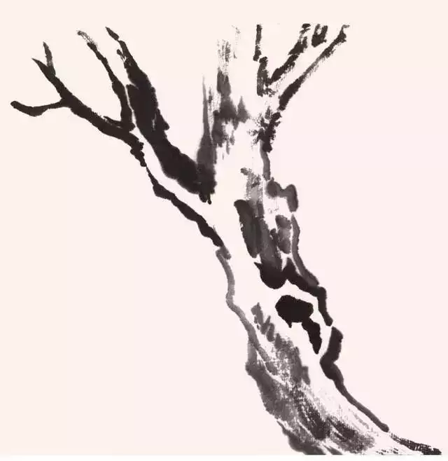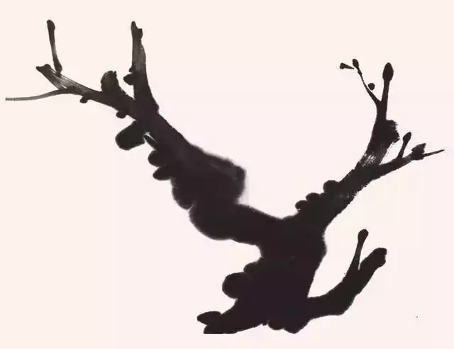 用泼墨画梅干,首先要注意墨色上浓淡干湿的变化,处理好蘸墨和调墨之间的关系,用大号硬毫提斗笔蘸饱墨色,侧锋逆行运笔,通过提按、顿挫以及笔的顺势强化笔法上的变化,要一次蘸墨一气呵成。对行笔当中出现的散锋或枯涩笔墨,要顺其自然予以保留,待墨色干透后通过墨色的罩染方可体现树木神貌。主干可用复笔画法,左右两笔并行排列,先左后右依次画出。