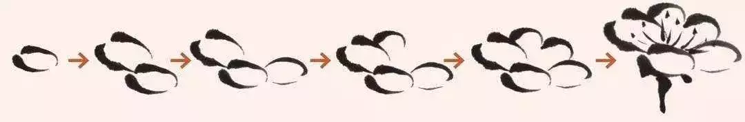 用小号狼毫或兼毫毛笔,调淡墨,勾出圆形小圈,一般是五瓣,因有正、侧遮挡,也可画四瓣、三瓣。圈好之后点花蕊,用小号狼毫毛笔蘸浓墨点蕊丝,从中间向四周呈放射状,再点出蕊头。