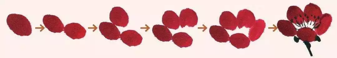 使用中号羊毫毛笔,调朱磦或朱砂,笔尖蘸曙红,侧锋行笔,点出花瓣,花形不宜太完整,要有大小,整缺区别。主要的花朵颜色略深一些,在密集的地方点一些淡色,可以增加层次感。