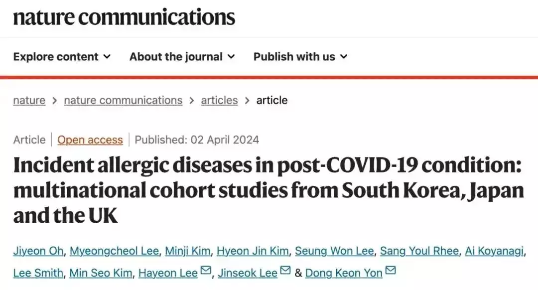 2024年4月,韩国庆熙大学的研究人员发表在《自然》子刊上的一项研究指出,新冠的感染与过敏性疾病风险上升有显著关系。