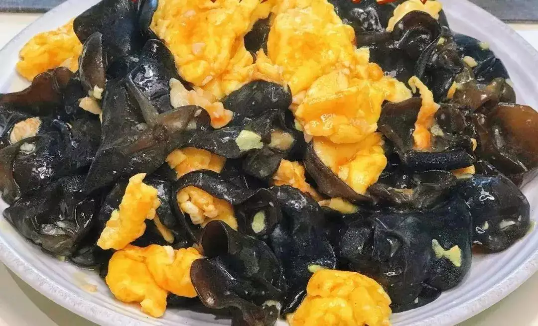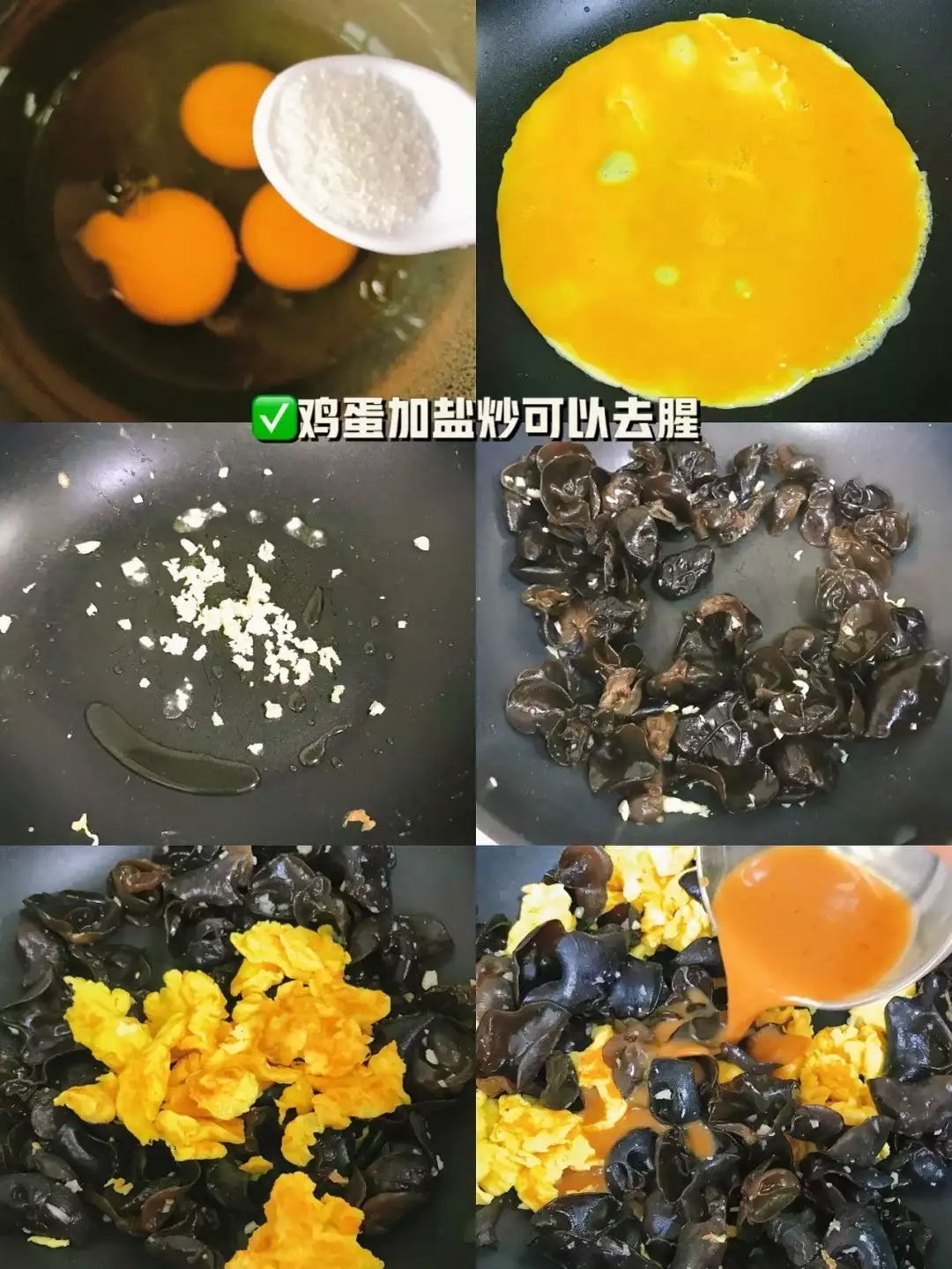 05.合炒:将之前炒好的黑木耳回锅,与鸡蛋一同翻炒均匀。根据个人口味,可加入少许生抽提鲜,最后撒上葱花增香,快速翻炒几下即可出锅装盘。
