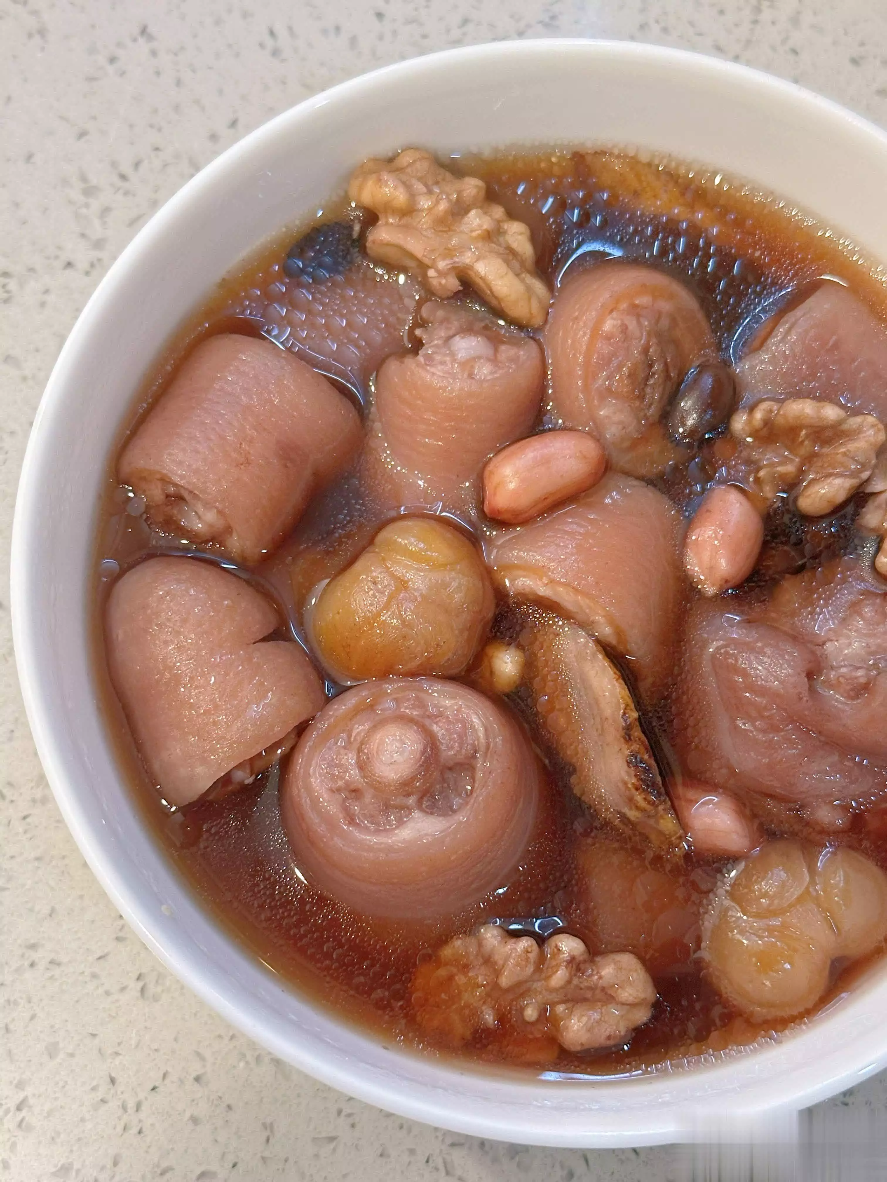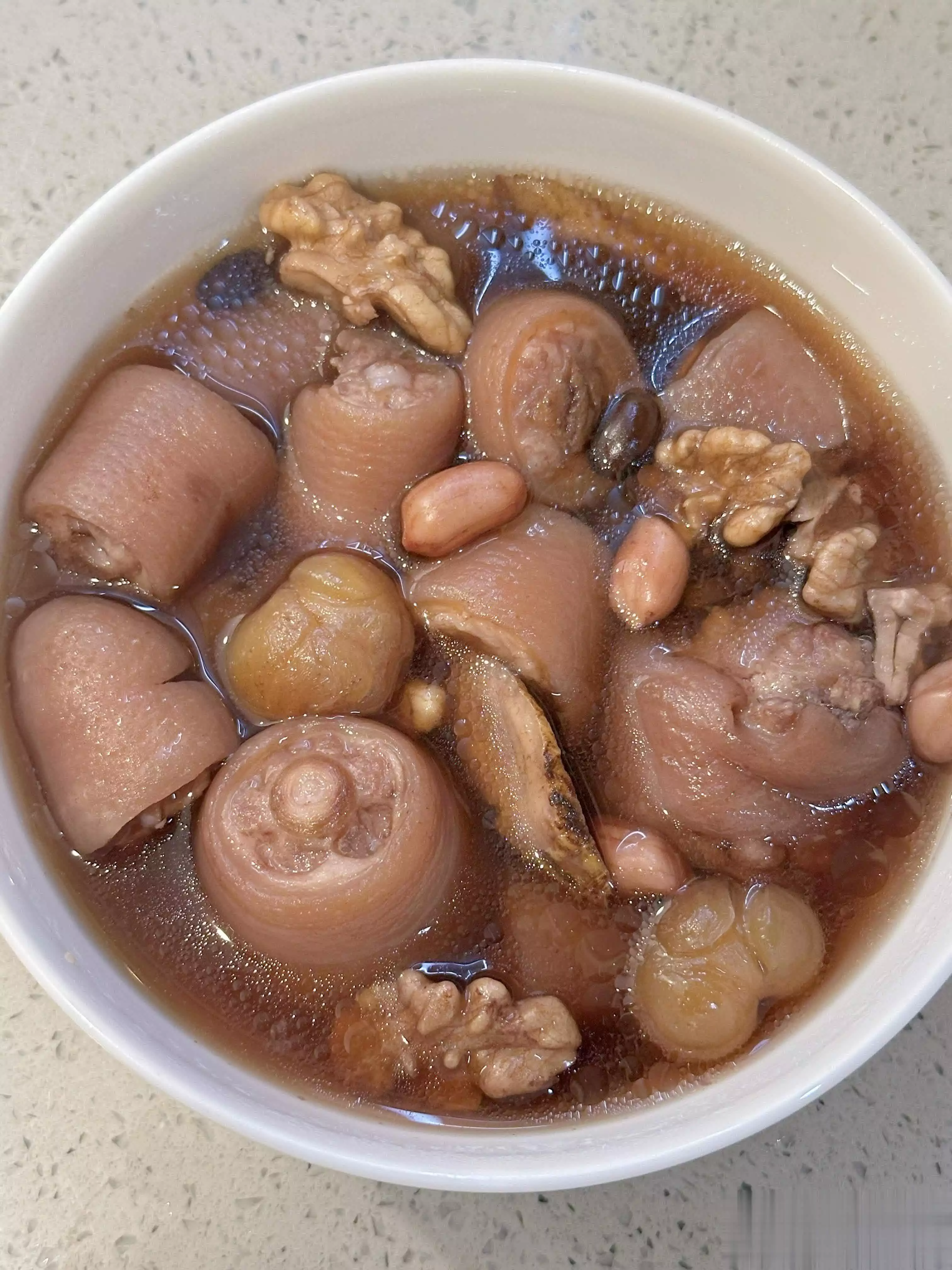 我一般会炖足两个钟头。时间到了,满屋都是暖呼呼的香气,汤色是清亮的茶褐色。这时只加一点点盐调味,味道就鲜得不得了。猪尾炖得软糯,胶质全融在汤里,黑豆和花生粉粉的,喝上一口,从喉咙暖到胃里,整个人都舒展开了。
