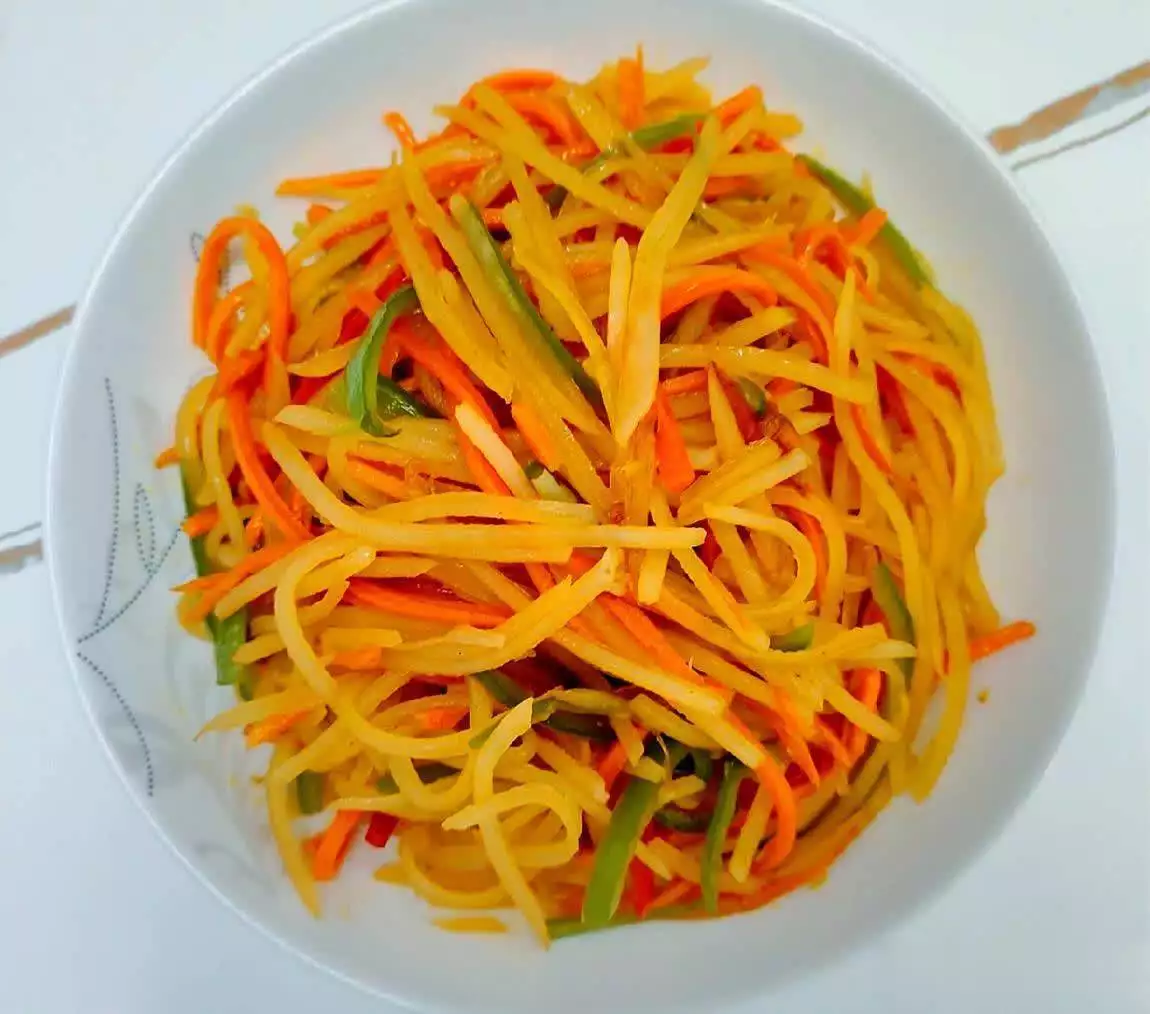 1. 切丝: 土豆和胡萝卜去皮,切成细丝(考验刀工,也可以用擦丝器)。土豆丝放入清水中浸泡,洗去多余淀粉,捞出沥干(这样炒出来才脆)。