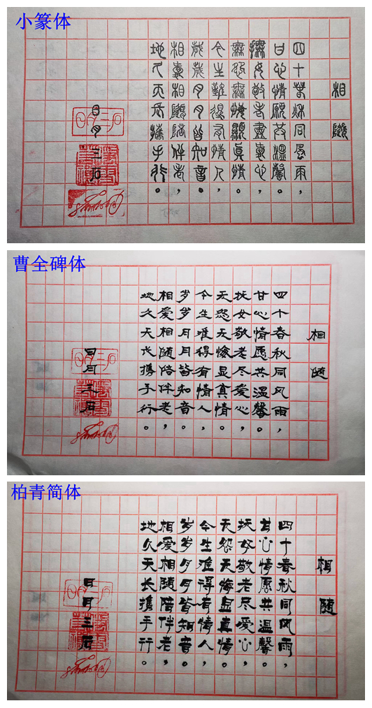 因为要将为红宝石婚庆而作【相随】装订,今用三种字体手写完成: