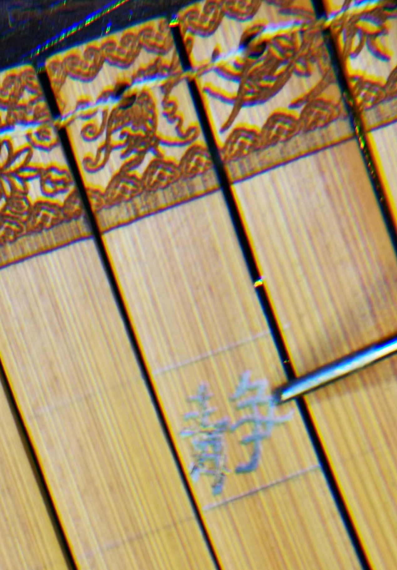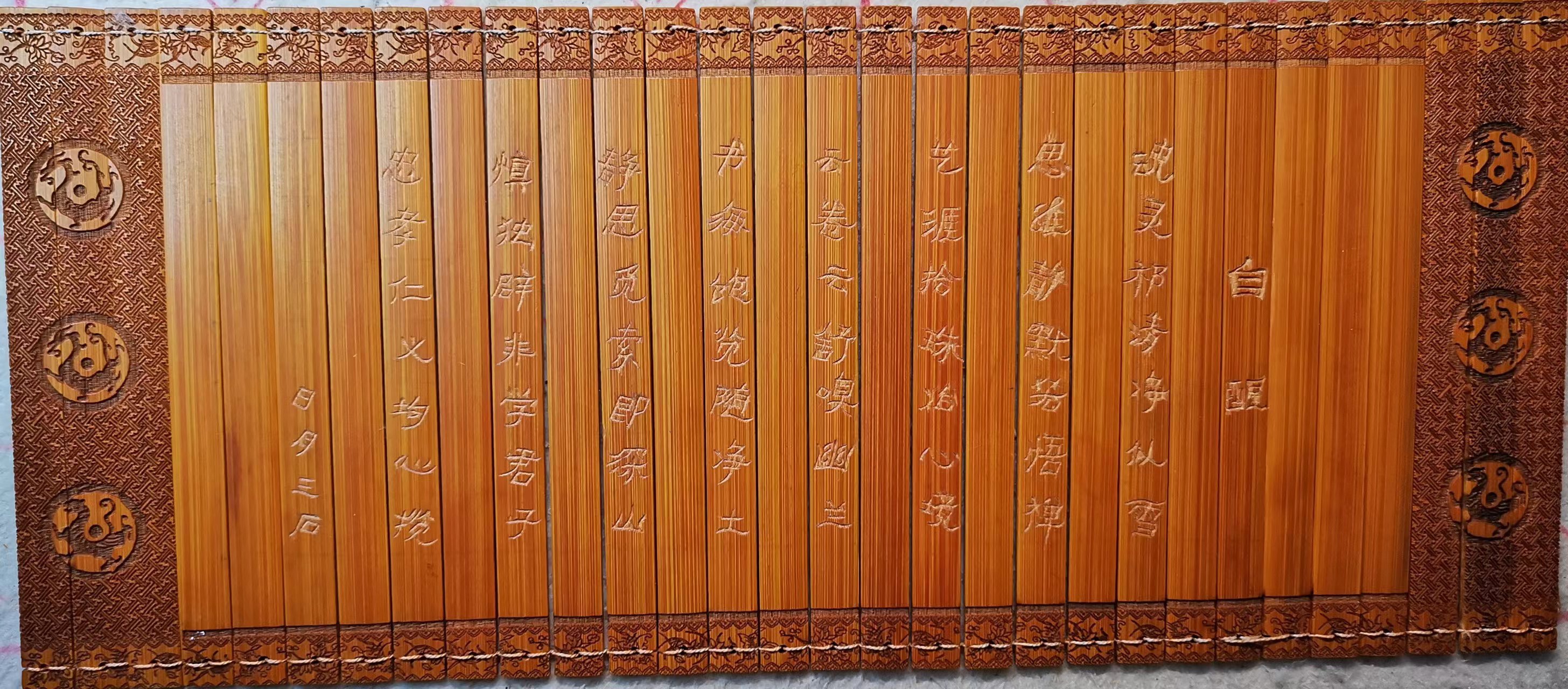 一天,突发奇想,古人用竹简留书,那么现在可不可以也尝试一下呢?说干就干,在网络上购买了一幅小号的竹简,确定好内容,就开始尝试。等到动手后,才知道自己操作是那么笨拙,远不是想象的那么简单,而且竹简材料里面含有竹丝,就更增加了难度。刚开始刻的字,难看极了,极大的打击了积极性。有一天看着那丑陋的东西,就想把它扔了,不刻了。